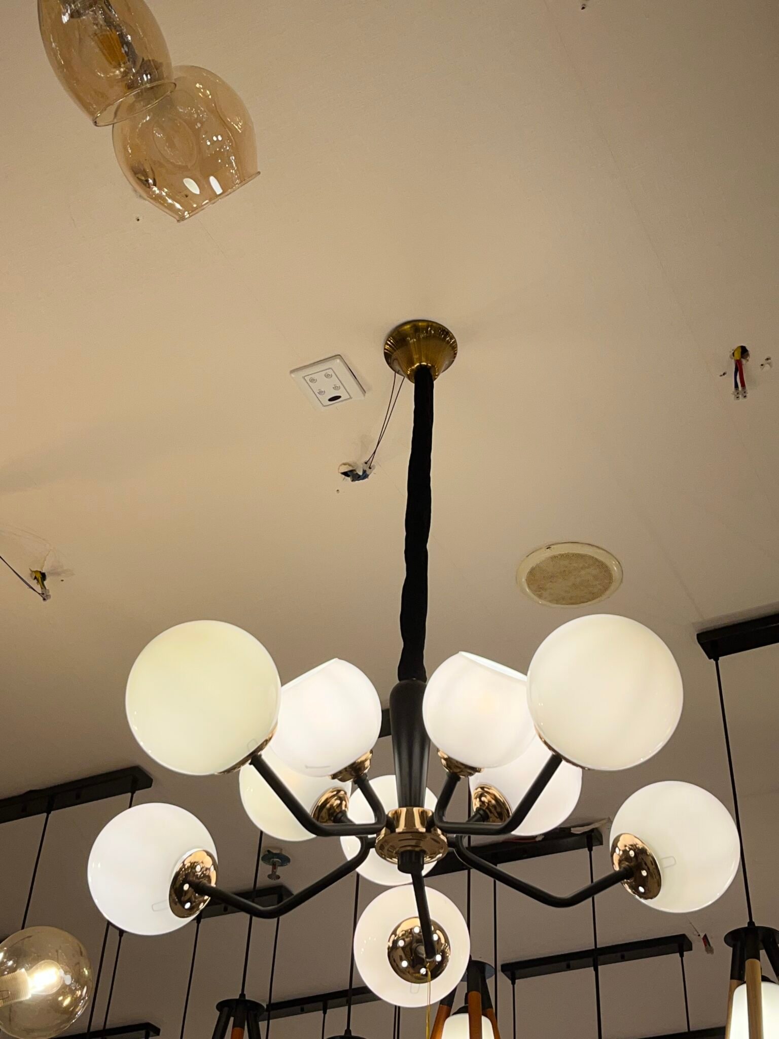 Overview The Chandelier Pendant Light is a statement piece designed to bring sophistication and style to any room. Featuring multiple spherical glass shades attached to a sleek black and gold frame, this chandelier provides both elegance and functional lighting, making it a perfect fit for large spaces such as dining rooms, living rooms, or entryways. Design & Features 🔹 Multiple Spherical Glass Shades – Nine round, frosted glass shades provide even, soft lighting and a striking visual impact. 🔹 Elegant Black & Gold Frame – The combination of matte black and gold accents gives the chandelier a luxurious and modern touch. 🔹 Adjustable Suspension – The hanging length can be customized to suit the space, allowing for a tailored look. 🔹 Durable Construction – Built with high-quality materials for longevity and stability. Lighting & Functionality 💡 Bright and Even Illumination – Provides ample light for larger spaces, ideal for creating a well-lit atmosphere. 💡 Energy-Efficient – Compatible with LED bulbs, offering efficient lighting with reduced energy consumption. 💡 Perfect for High Ceilings – Its elongated design is perfect for large or high-ceilinged rooms, making a dramatic impact. ApplicationsIdeal for Dining Rooms & Living Rooms – Adds a touch of elegance to dining areas or living rooms with ample illumination. ✔ Great for Foyers & Entryways – Perfect for making a lasting first impression in grand entrances. ✔ Suitable for Commercial Spaces – Elevates the ambiance of restaurants, hotels, or large offices with its sophisticated design. ✔ Blends with Modern & Classic Decor – Complements both modern and traditional interior styles. The Chandelier Pendant Light is the perfect blend of style, elegance, and functionality, offering high-quality illumination while enhancing the aesthetic appeal of any large space.