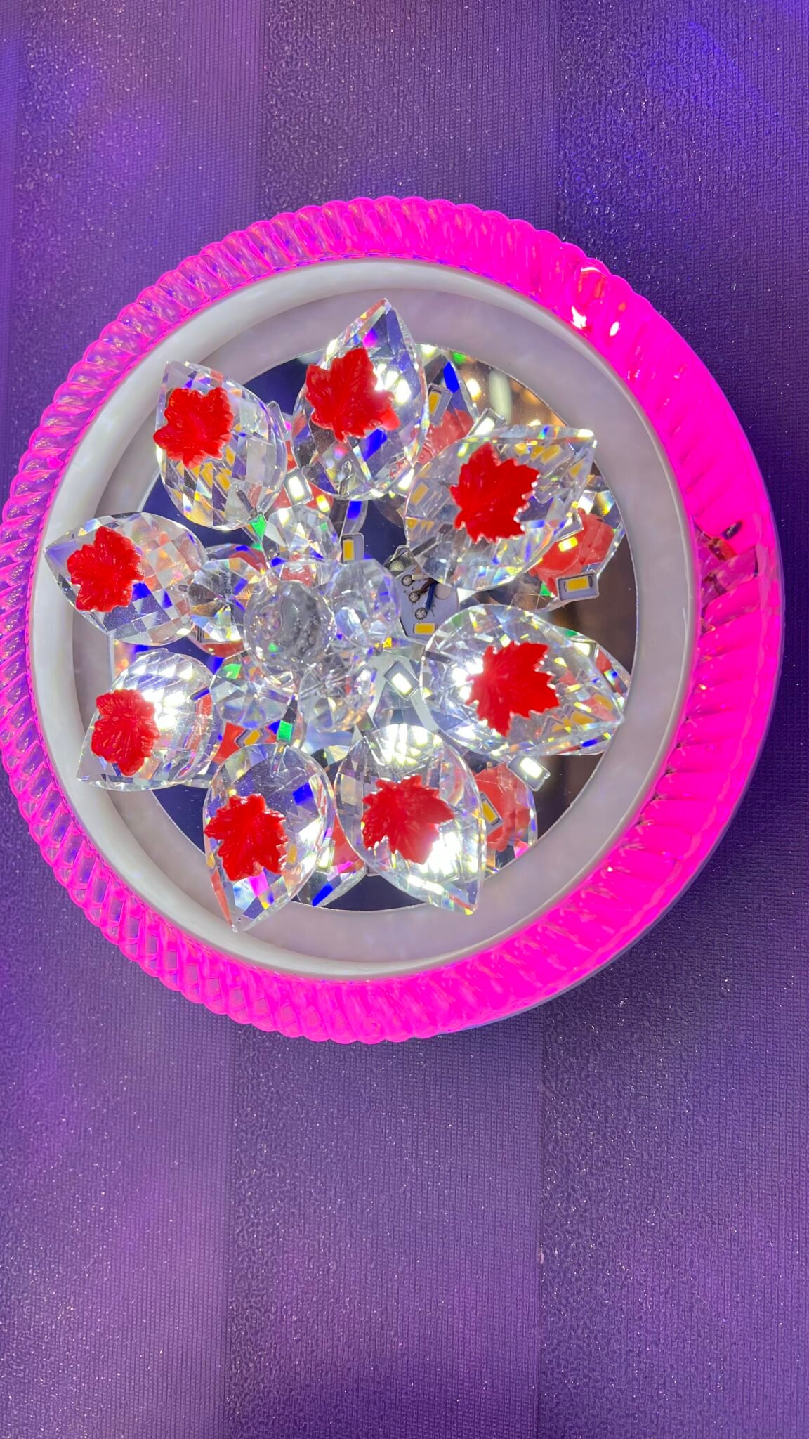Elegant Crystal Floral Design – Features a brilliantly crafted floral pattern with high-grade K9 crystal elements for exceptional light refraction and a dazzling glow. 💡 Multicolor LED Glow – The outer rim is illuminated in a vivid pink hue, enhancing the luxurious appeal of the fixture. The central light provides a warm and welcoming ambiance. 🌺 Red Floral Accents – Each crystal petal features a red floral embellishment, adding a unique and artistic aesthetic. 🔋 Energy-Efficient LED Technology – Integrated high-performance LED chips ensure long-lasting, energy-saving illumination. 🛠️ Premium Build Quality – Constructed with durable acrylic, stainless steel, and precision-cut crystals, offering a sleek, modern, and high-end finish. 🎮 Remote-Controlled Light Modes – Some models come with an adjustable lighting mode, allowing you to switch between white, warm white, and RGB colors.